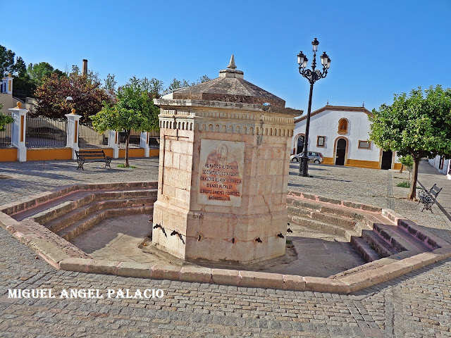 Seguimos paseando hasta llegar a la plaza de la Fuente, allí nos encontramos con la Fuente y el Lavadero. La Fuente está construida en mármol rosa y con forma de prisma octogonal, constituía el depósito donde se recibía el agua procedente de la Sierra de San Pablo para abastecer a la población. Edificada en 1875, a la fuente le sigue un abrevadero que daba de beber al ganado y por último el lavadero público, del que se conserva la fachada.