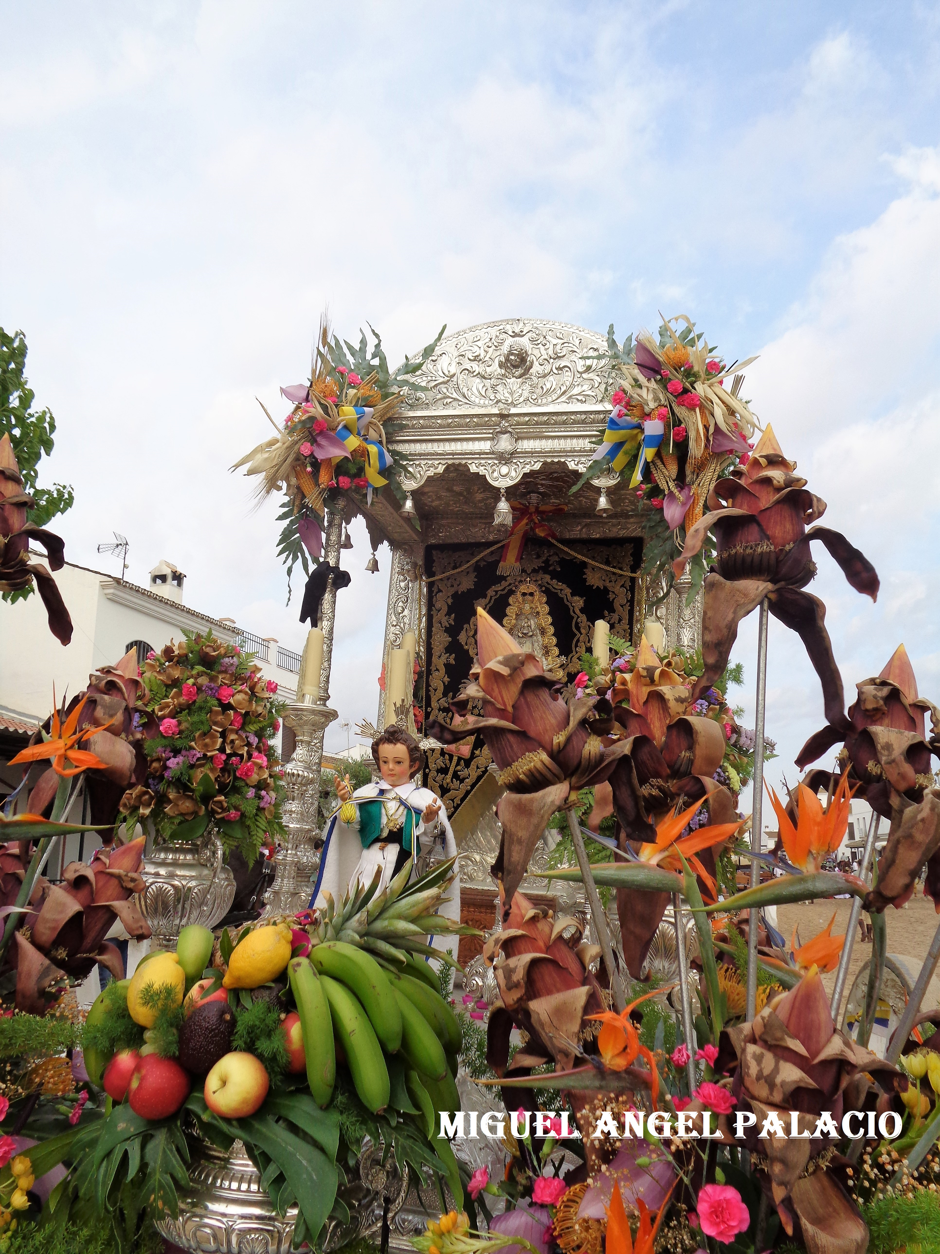 En la misma plaza de El Real y a ambos lados de la hermandad sanluqueña vemos primero la hermandad de Triana y después la de Huelva con su particular exorno floral exuberante y colorido.